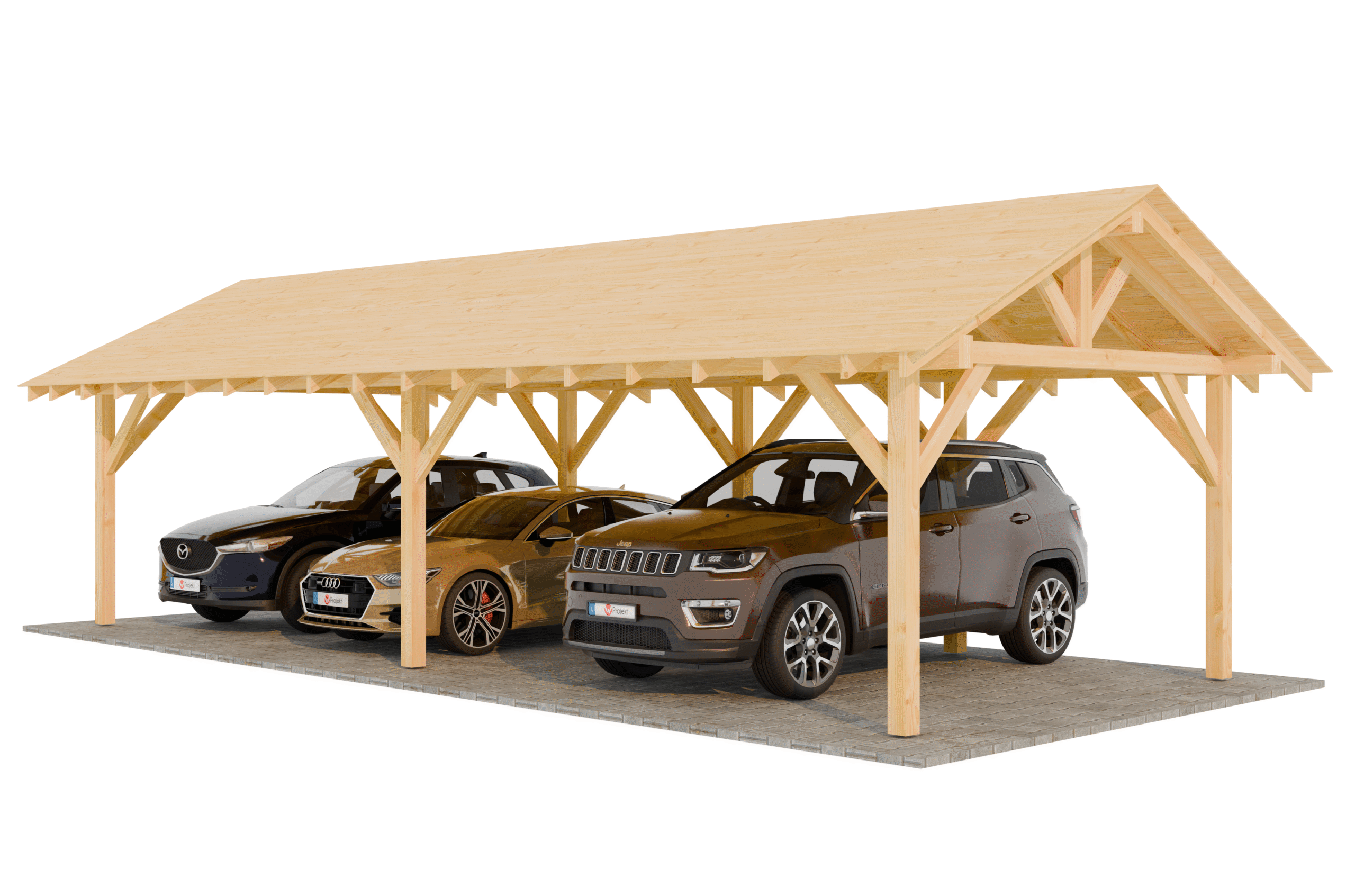 Konstrukcja wiaty trzystanowiskowej 4×10 na trzy samochody lub do przechowywania materiałów, zaprojektowana w nowoczesnym stylu.