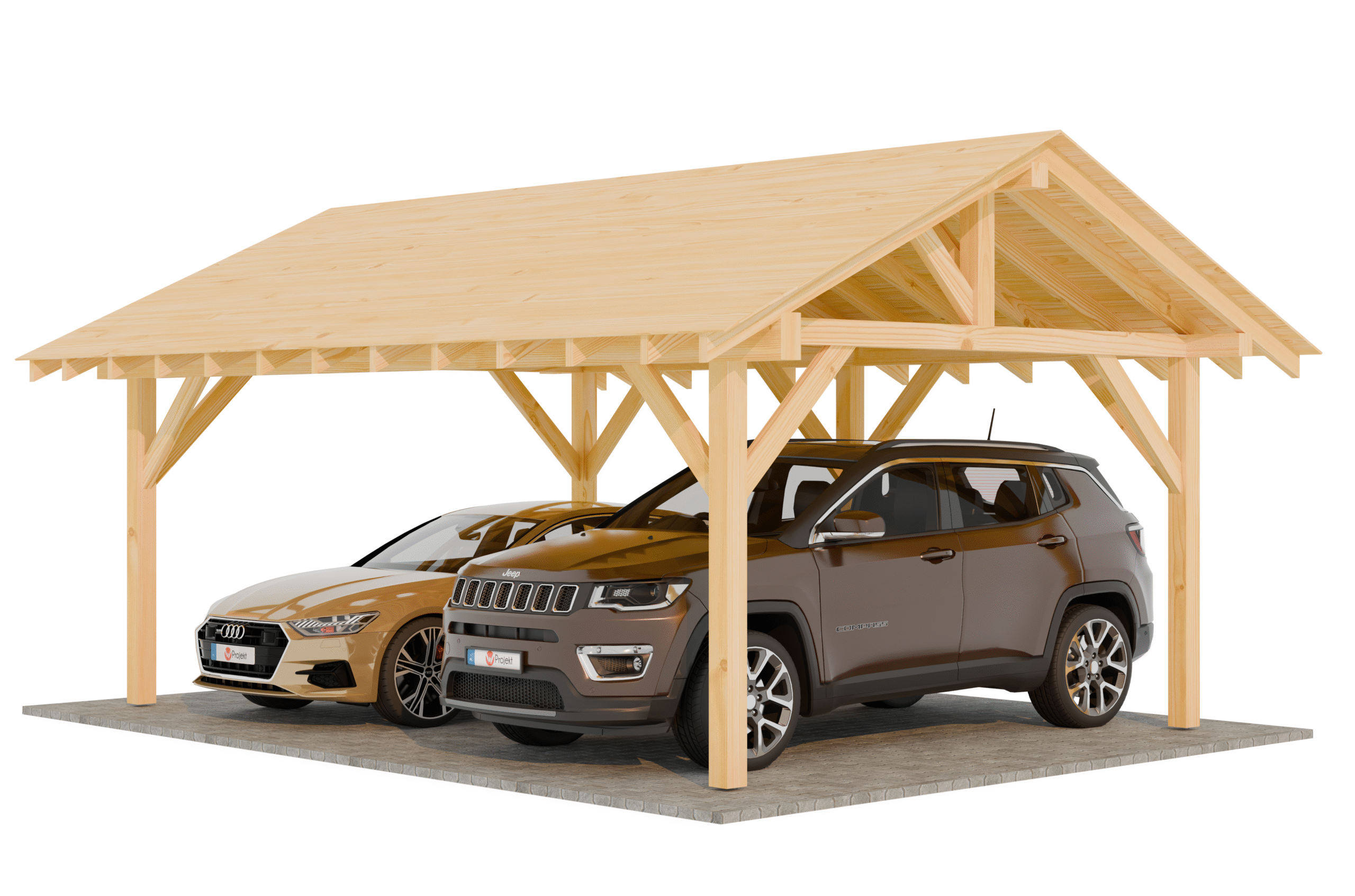 Konstrukcja wiaty dwustanowiskowej 4×6 na dwa samochody lub do przechowywania materiałów, zaprojektowana w nowoczesnym stylu.