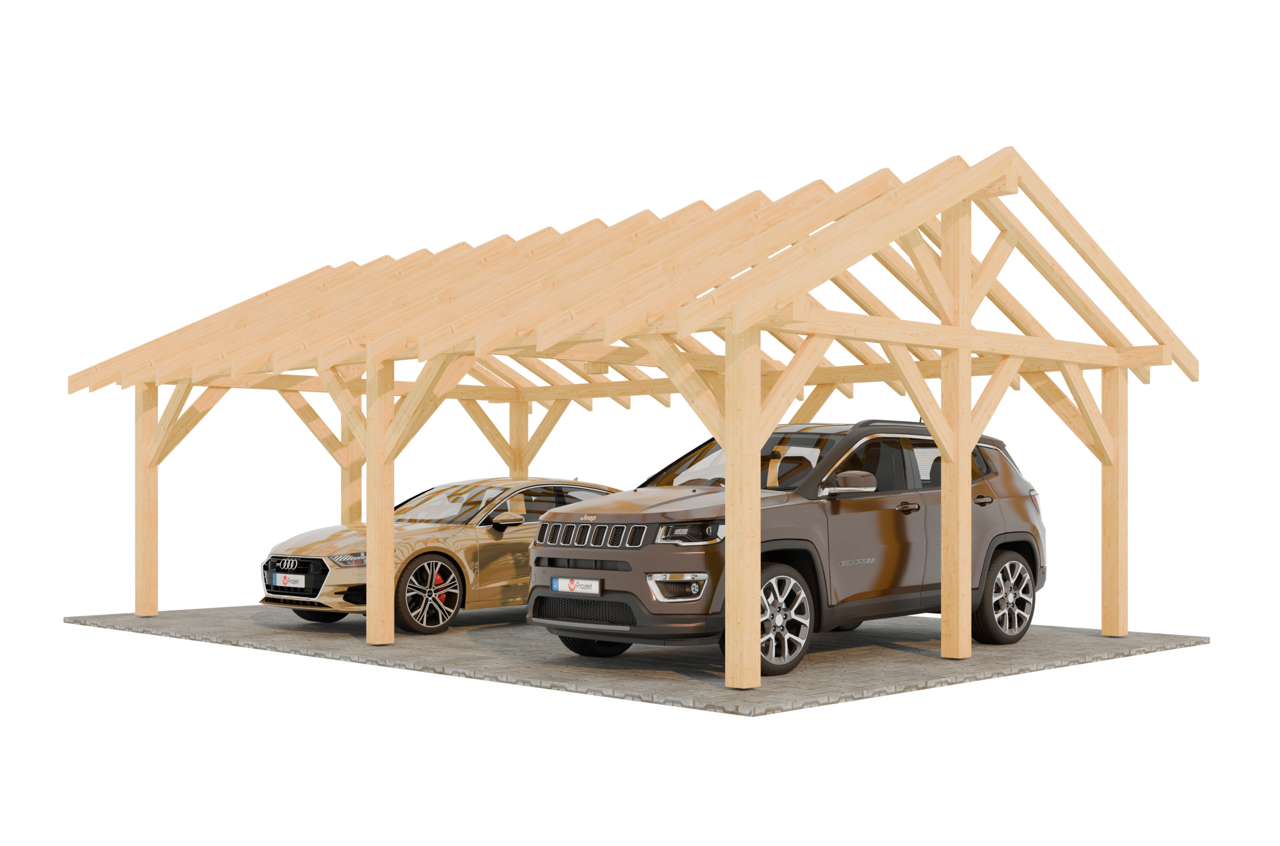 Konstrukcja wiaty dwustanowiskowej 5×8 na dwa samochody lub do przechowywania materiałów, zaprojektowana w nowoczesnym stylu.