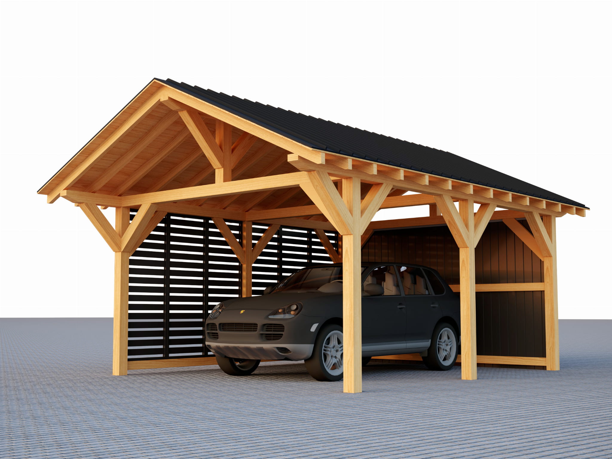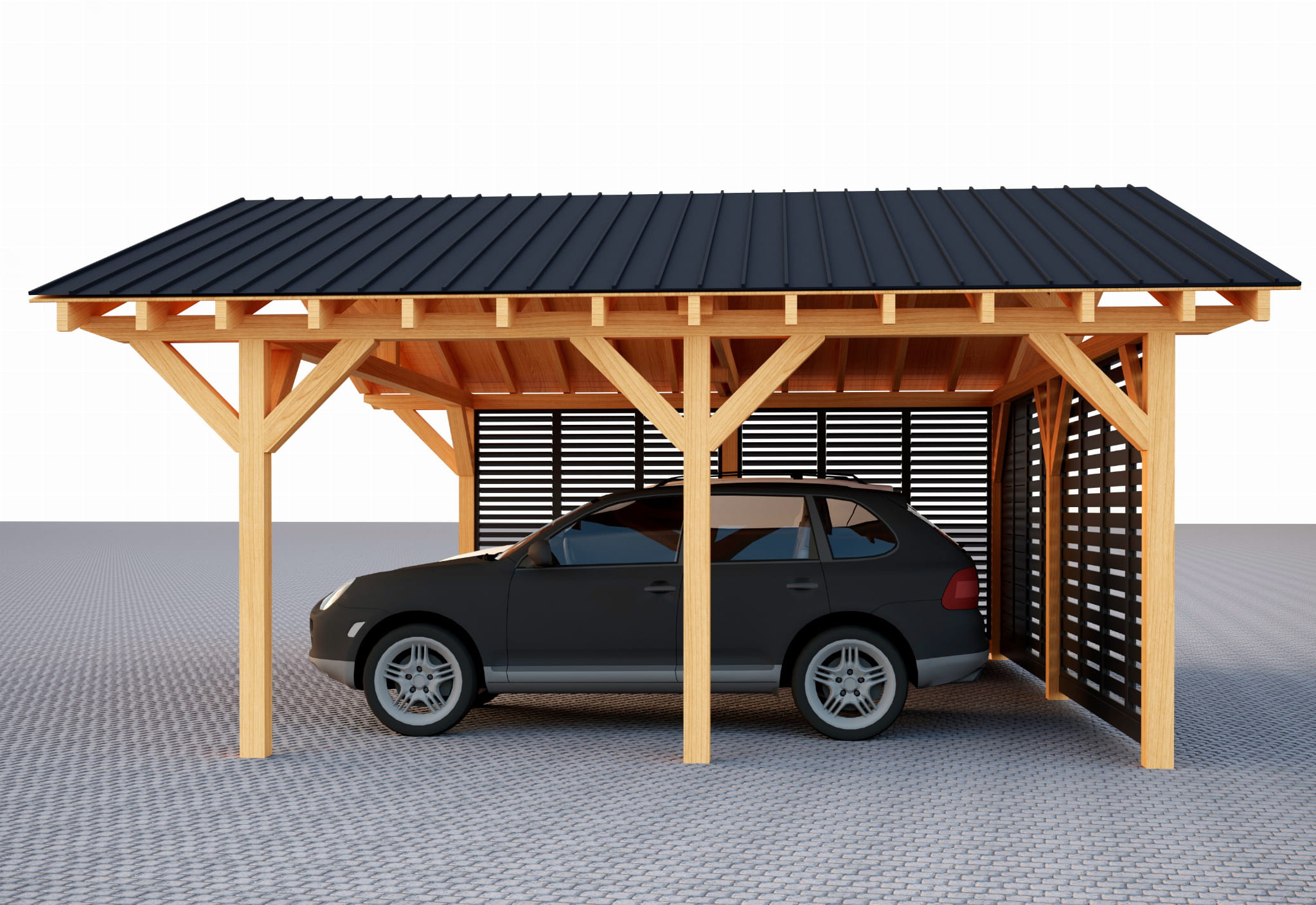 Konstrukcja wiaty jednostanowiskowej KORSYKA to wygodna i funkcjonalna wiata drewniana na samochód lub do przechowywania materiałów, zaprojektowana w nowoczesnym stylu. To świetne rozwiązanie dla inwestorów, którzy chcą połączyć funkcję wiaty garażowej z konstrukcją wsporczą pod panele fotowoltaiczne.