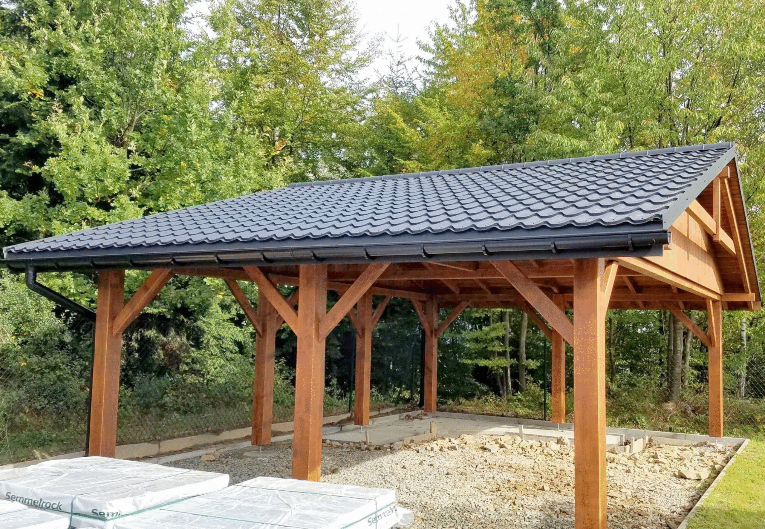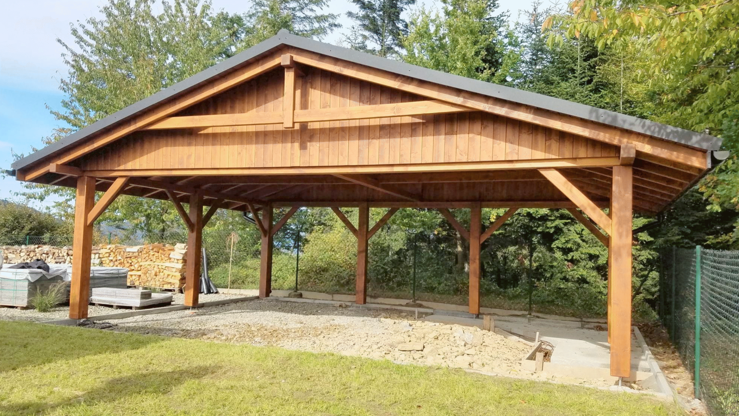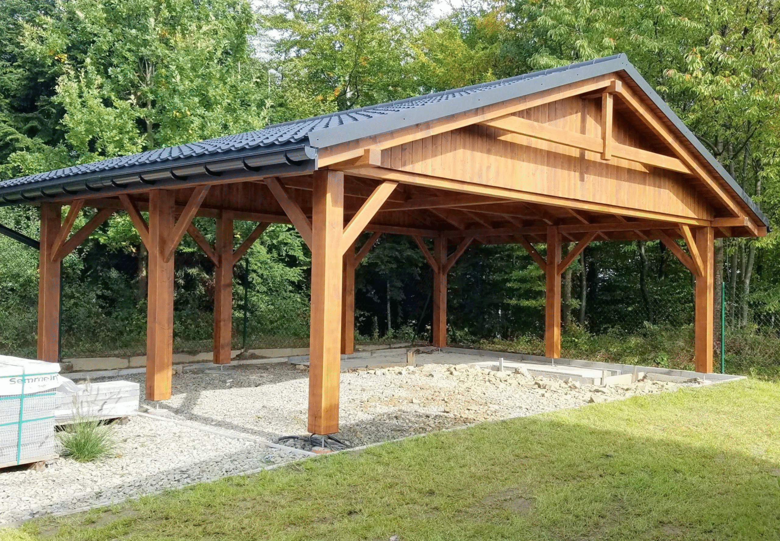 Wiata drewniana 5 m x 8 m z dachem dwuspadowym na masywnych słupach 20 x 20 cm to solidna i elegancka konstrukcja przeznaczona do parkowania dwóch samochodów osobowych. Projekt został przygotowany z dużą dbałością o detale, dzięki czemu wiata prezentuje się nowocześnie i harmonijnie wpisuje się w przestrzeń ogrodu. Jej proporcje i estetyka sprawiają, że pełni zarówno funkcję praktyczną, jak i dekoracyjną.