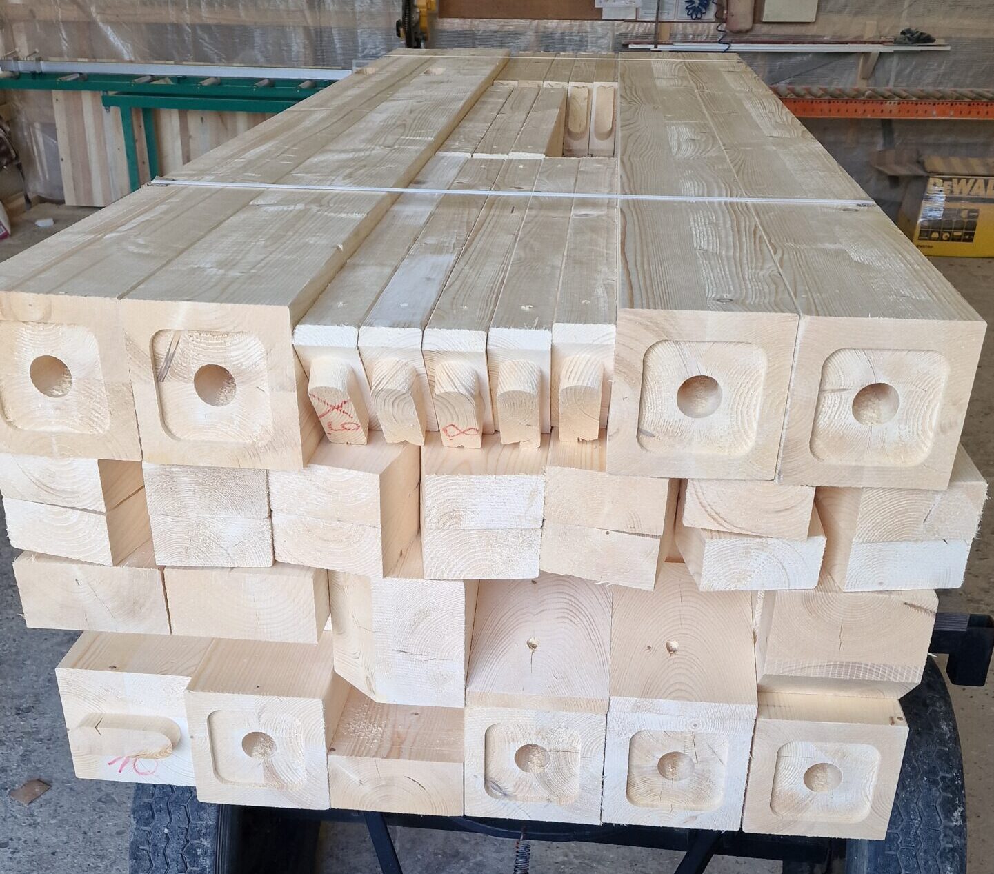 Standard obejmuje konstrukcję struganą oraz wykonanie wszystkich elementów na maszynie CNC. Wszystkie obróbki ciesielskie, takie jak gniazda, czopy, wiercenia i jaskółcze ogony, są przygotowane z dużą precyzją, co przekłada się na sztywną i trwałą konstrukcję. Każdy element jest ponumerowany zgodnie z projektem, co znacząco ułatwia pracę podczas montażu.