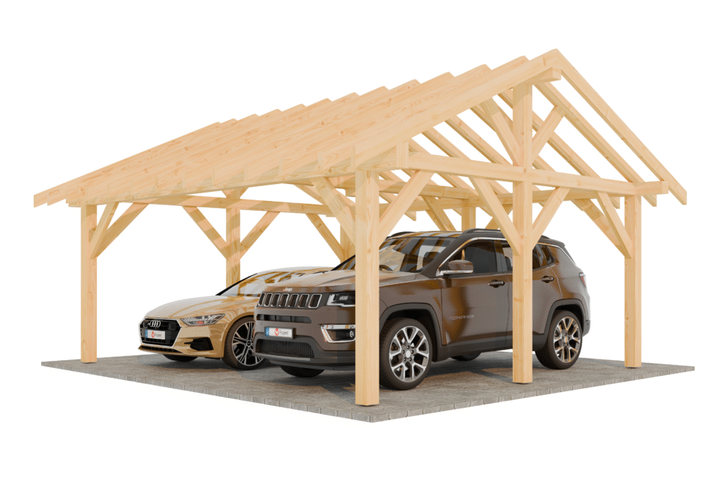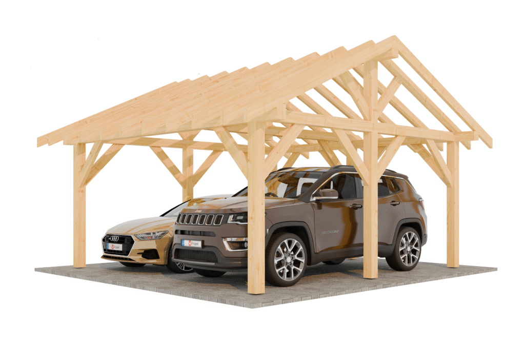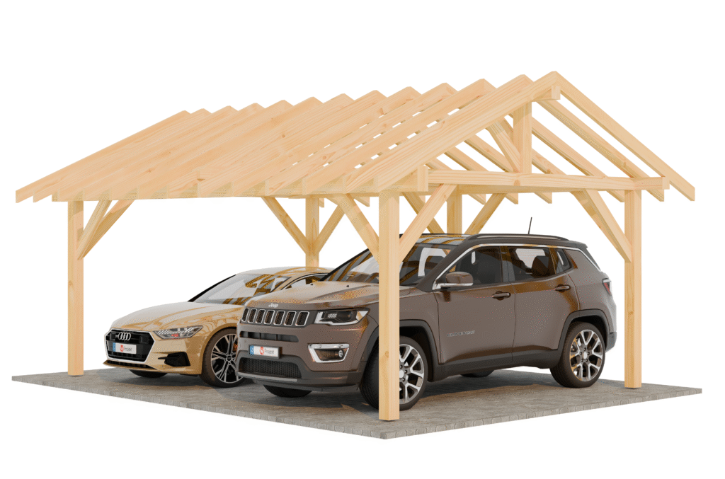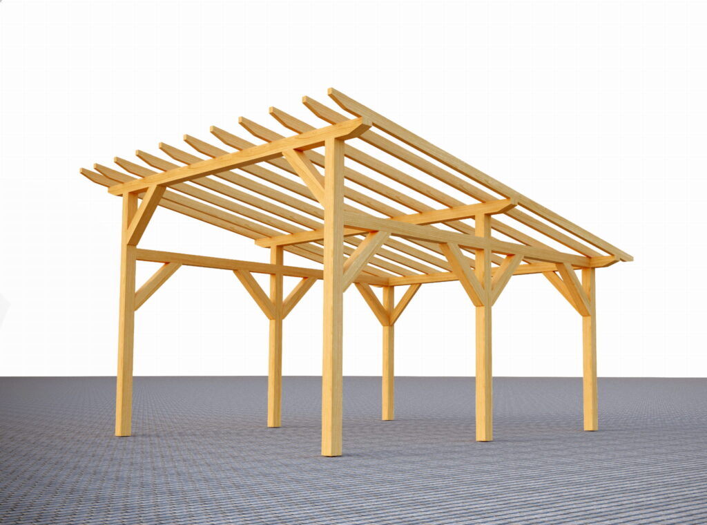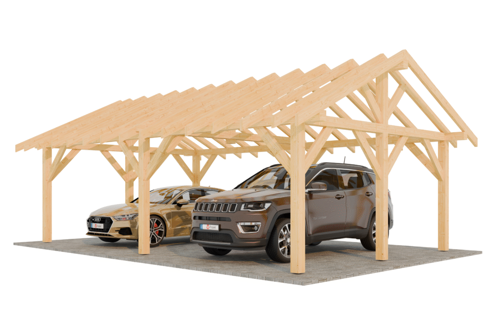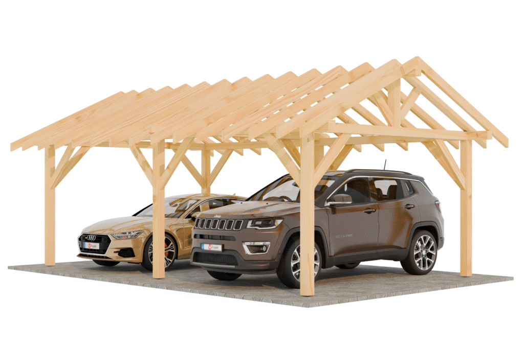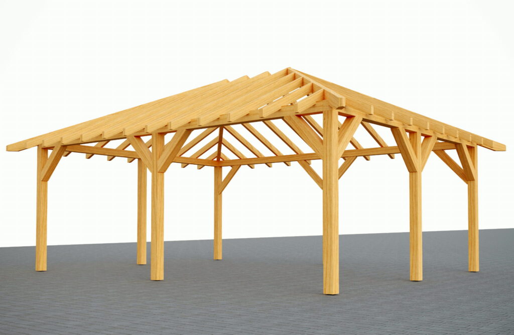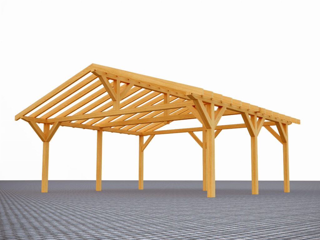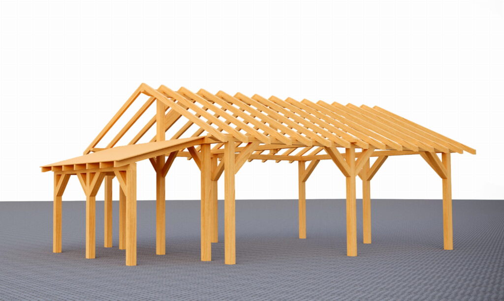 Konstrukcja wiaty dwuspadowej dwustanowiskowej IKARIA 5×6,5 z przybudówką 3,5×1,5