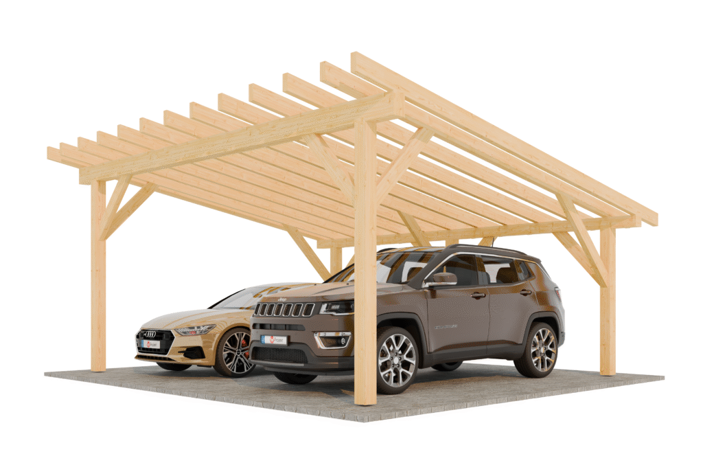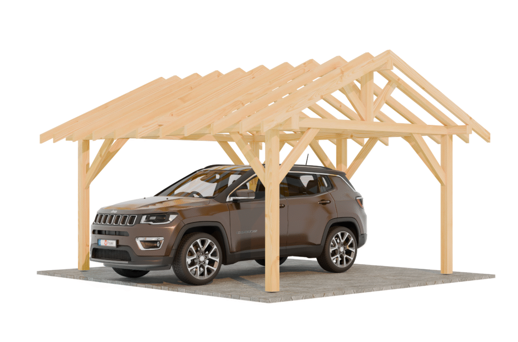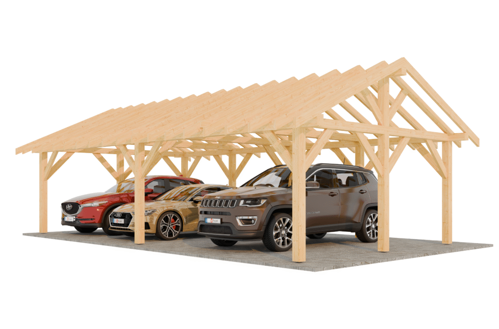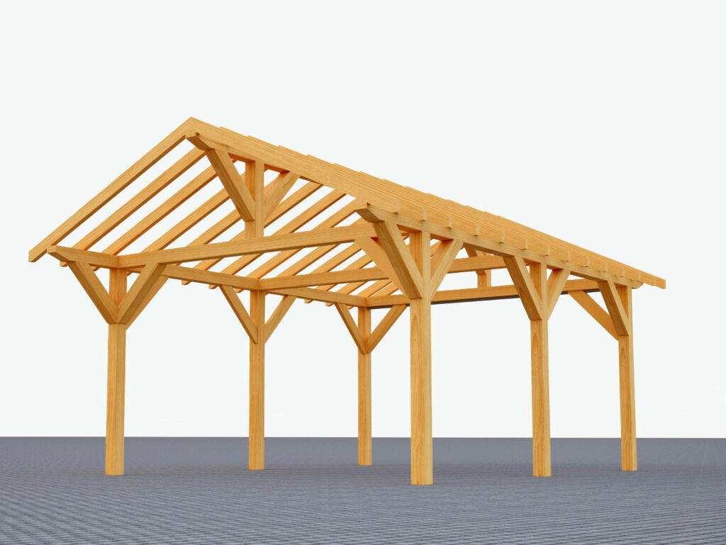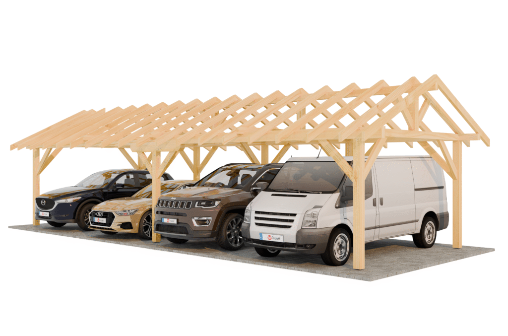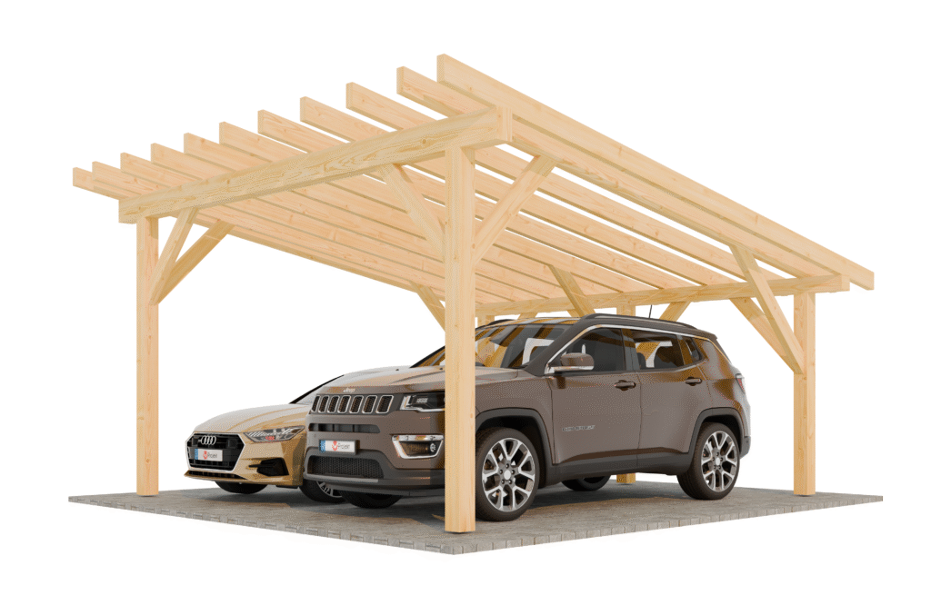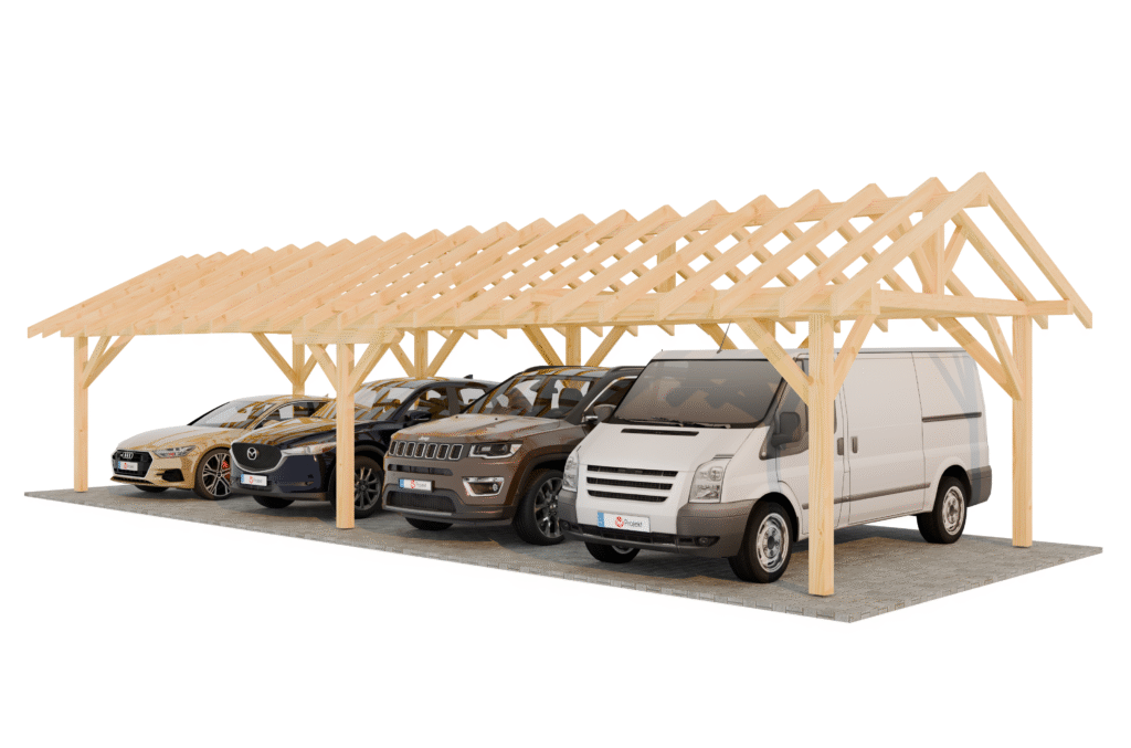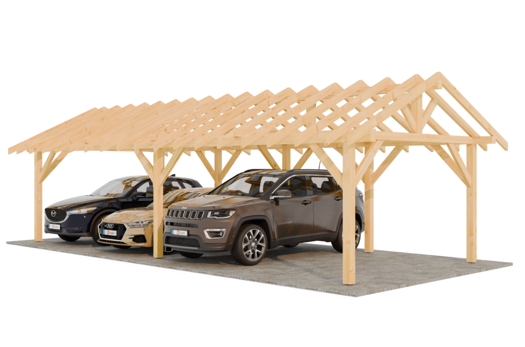 Konstrukcja wiaty dwuspadowej dwustanowiskowej IKARIA 5×6,5 z przybudówką 3,5×1,5