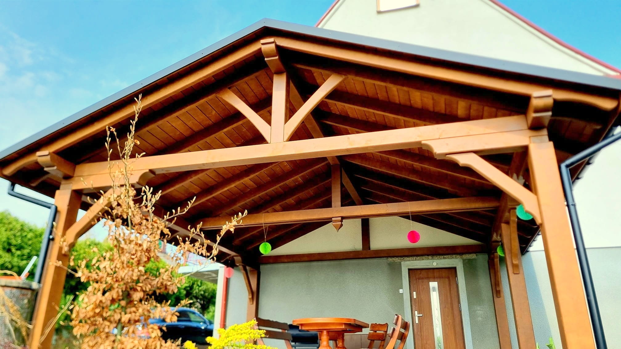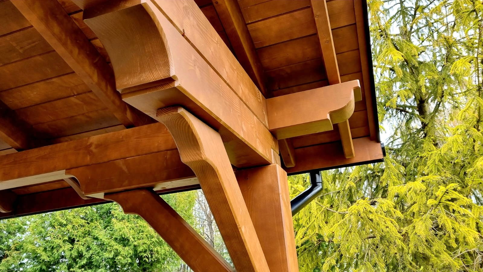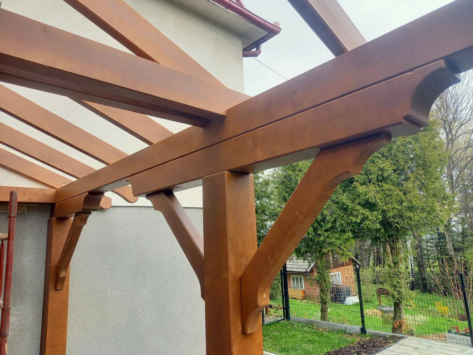Oferta dotyczy wiaty szlifowanej. Wiata przez nas przygotowana jest docięta komputerowo na maszynie CNC oraz posiada wszystkie konieczne obróbki ciesielskie, tj. gniazda, czopy, wiercenia, jaskółcze ogony.