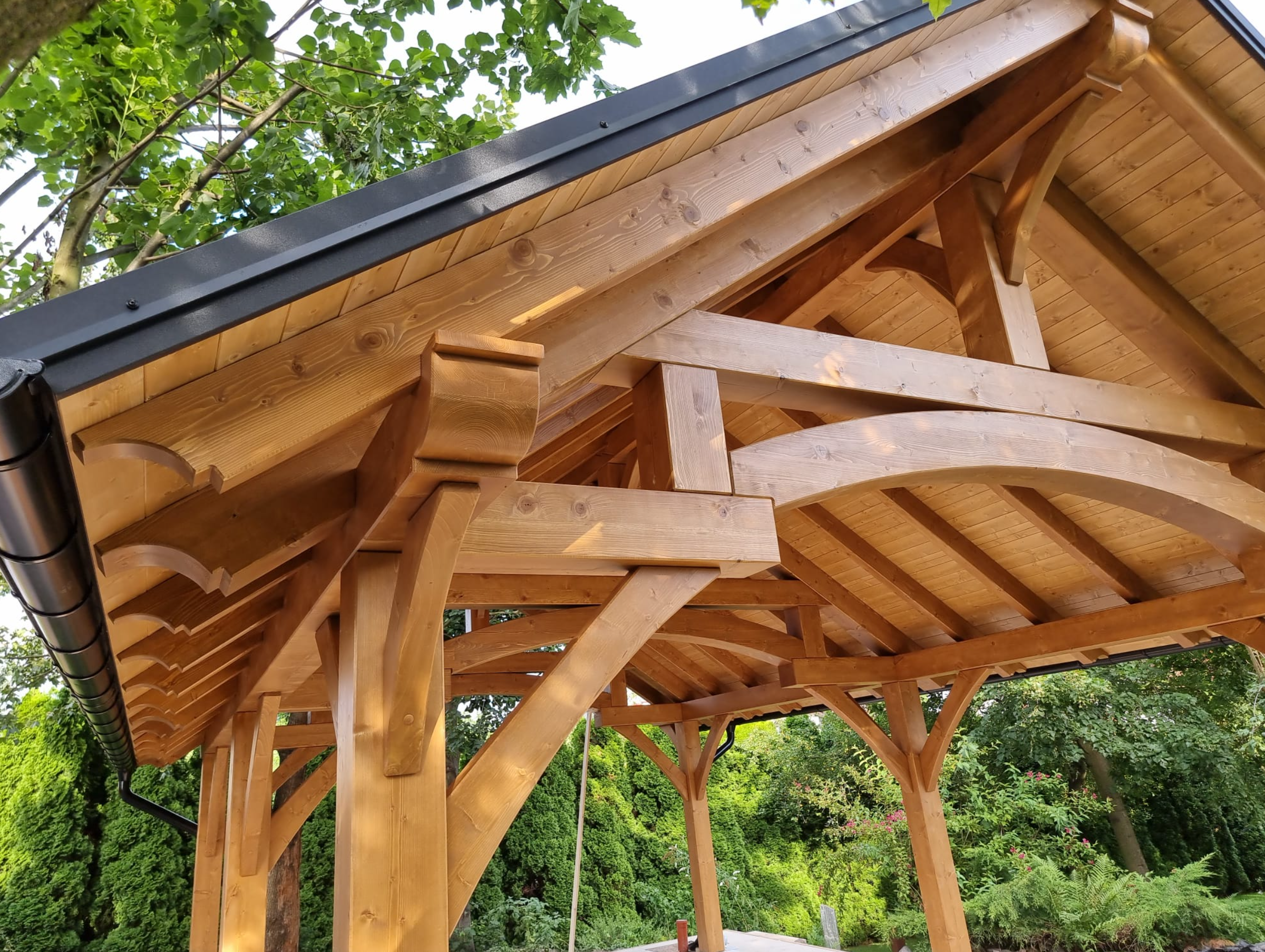 Wiata 5m x 7m Węgrzce – bogato zdobiona wiata w stylu rustykalnym o masywnych przekrojach 20×20 cm z solidnego drewna konstrukcyjnego w technologii BSH . Realizacja ta  charakteryzuje niepowtarzalnym wzornictwem. Bryła wiaty została zaprojektowana z najwyższą starannością. Atrakcyjny wygląd drewnianej konstrukcji sprawia, że wpisze się ona w przestrzeń ogrodu, stanowiąc jego niewątpliwą ozdobę.