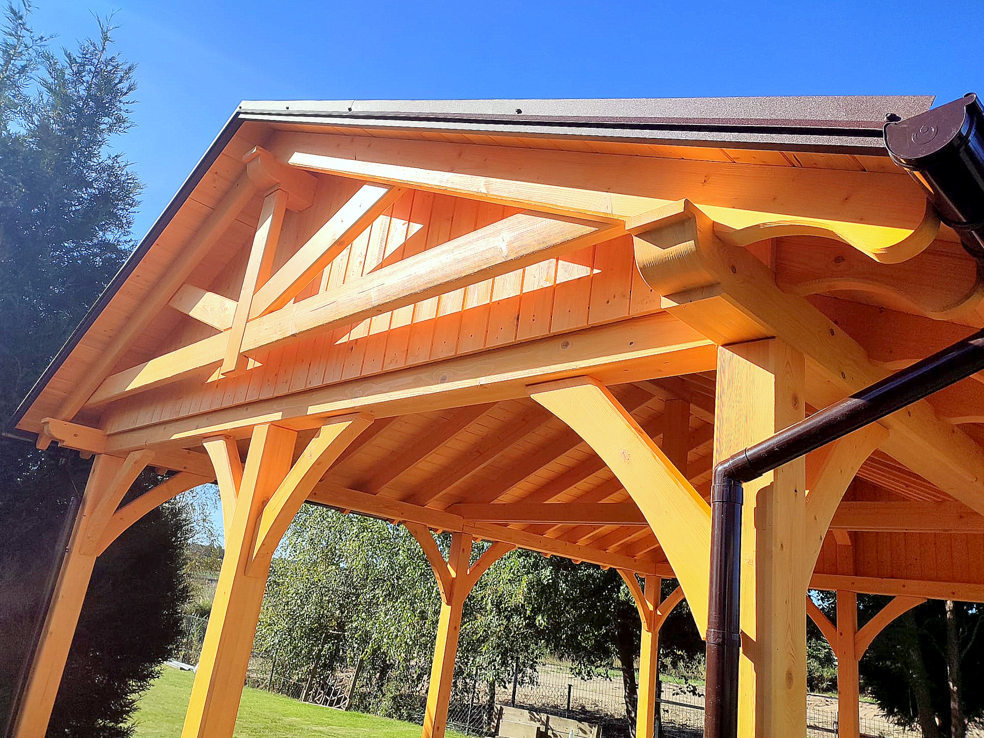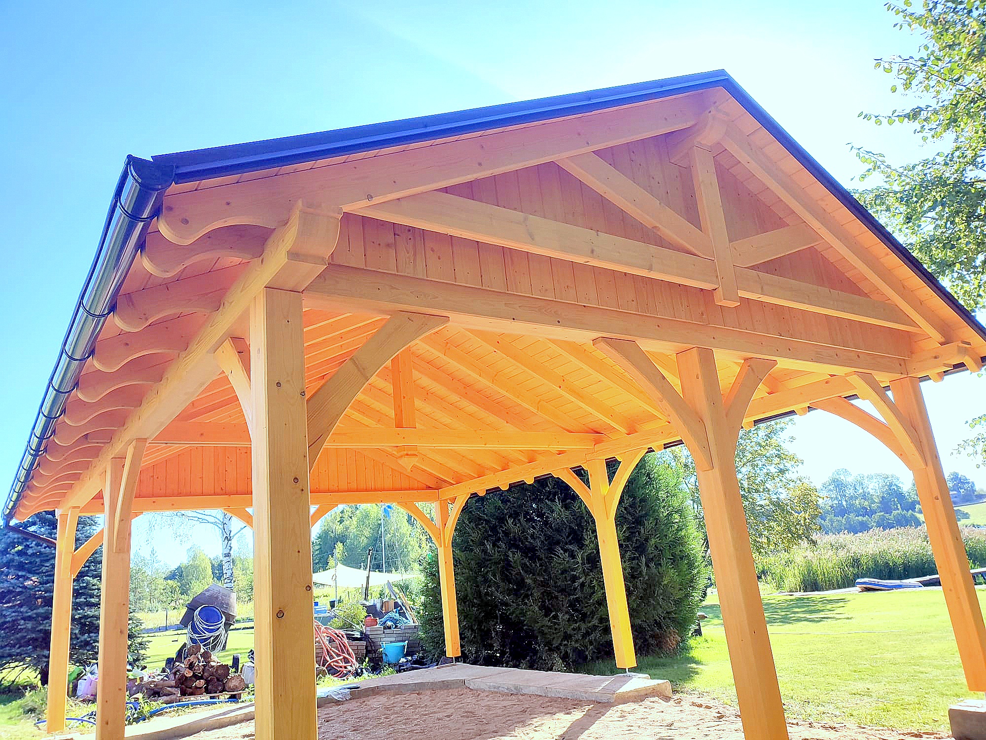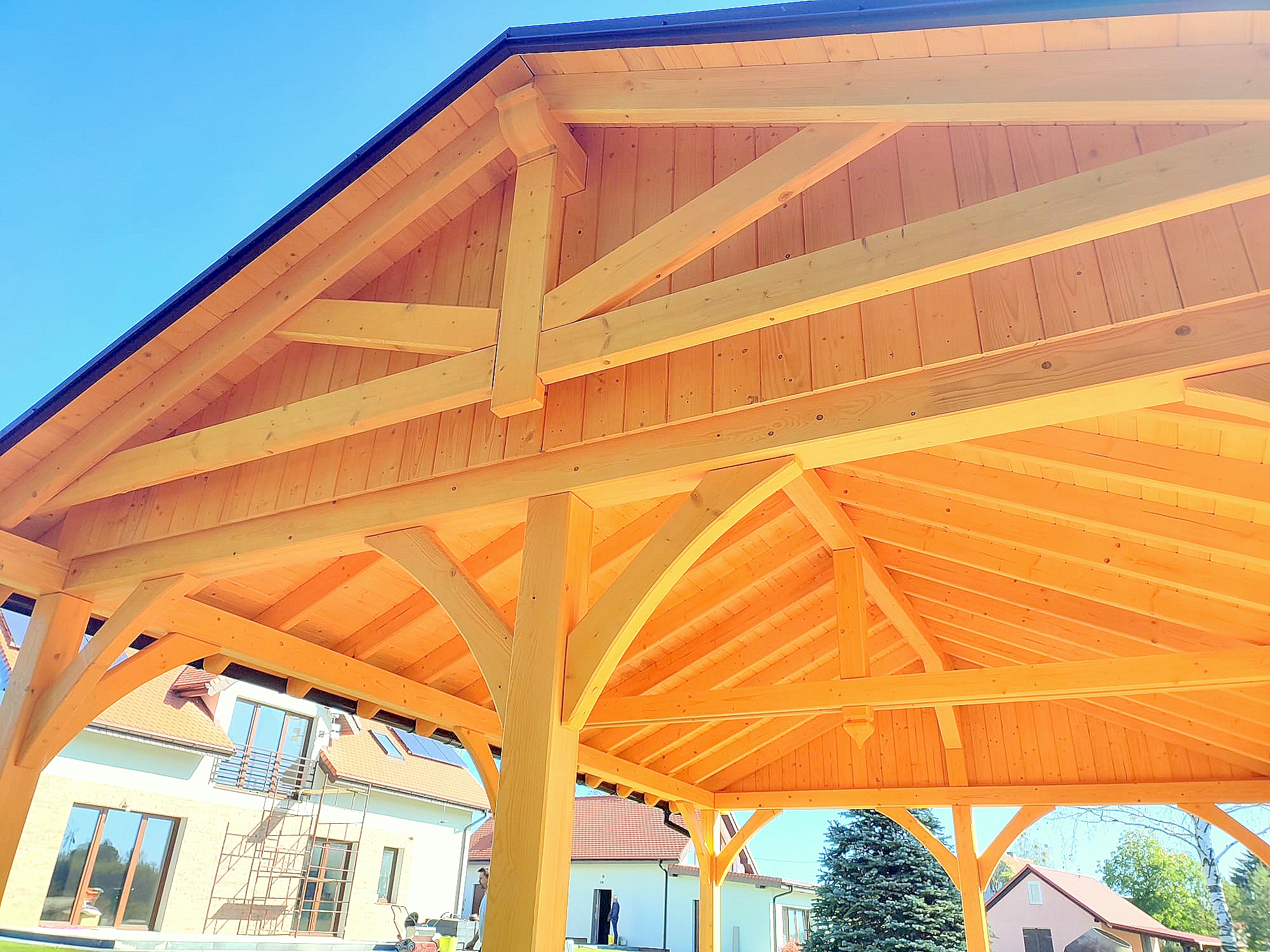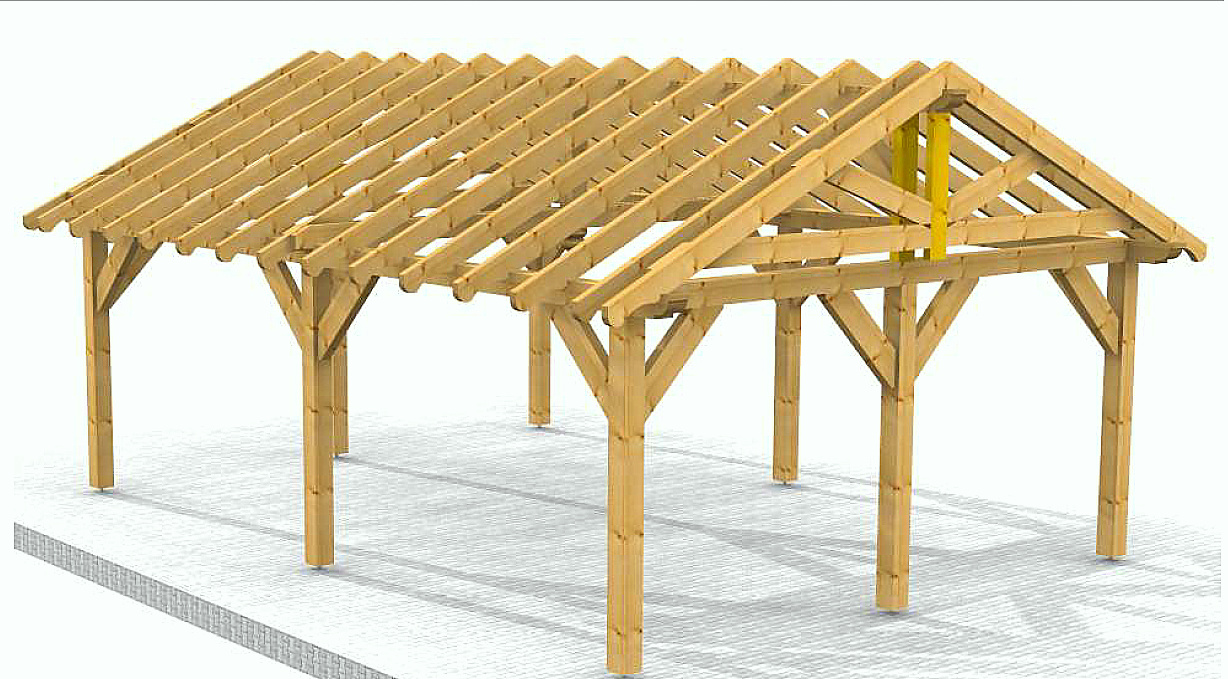 Oferta dotyczy wiaty szlifowanej. Wiata przez nas przygotowana jest docięta komputerowo na maszynie CNC oraz posiada wszystkie konieczne obróbki ciesielskie, tj. gniazda, czopy, wiercenia, jaskółcze ogony.