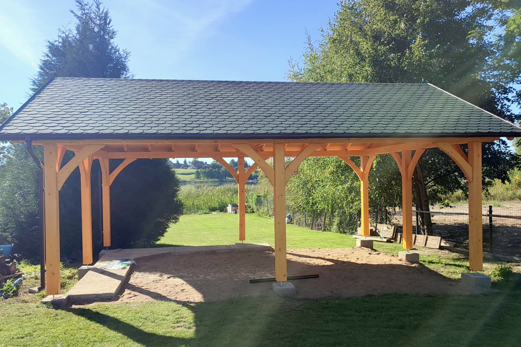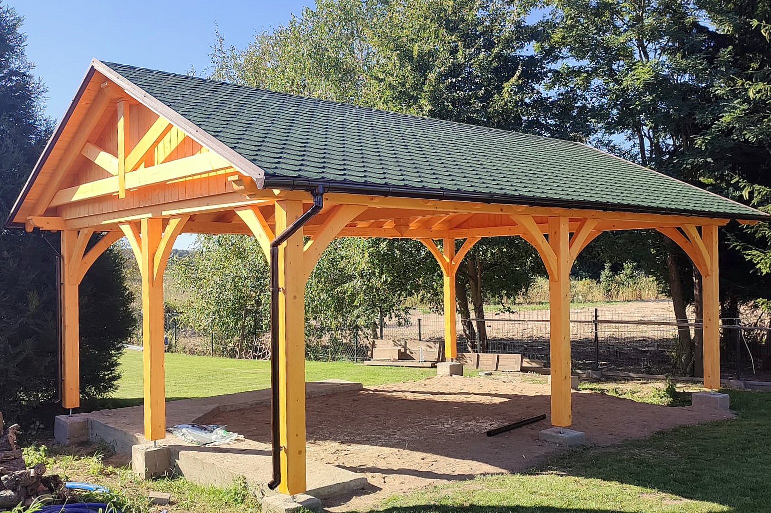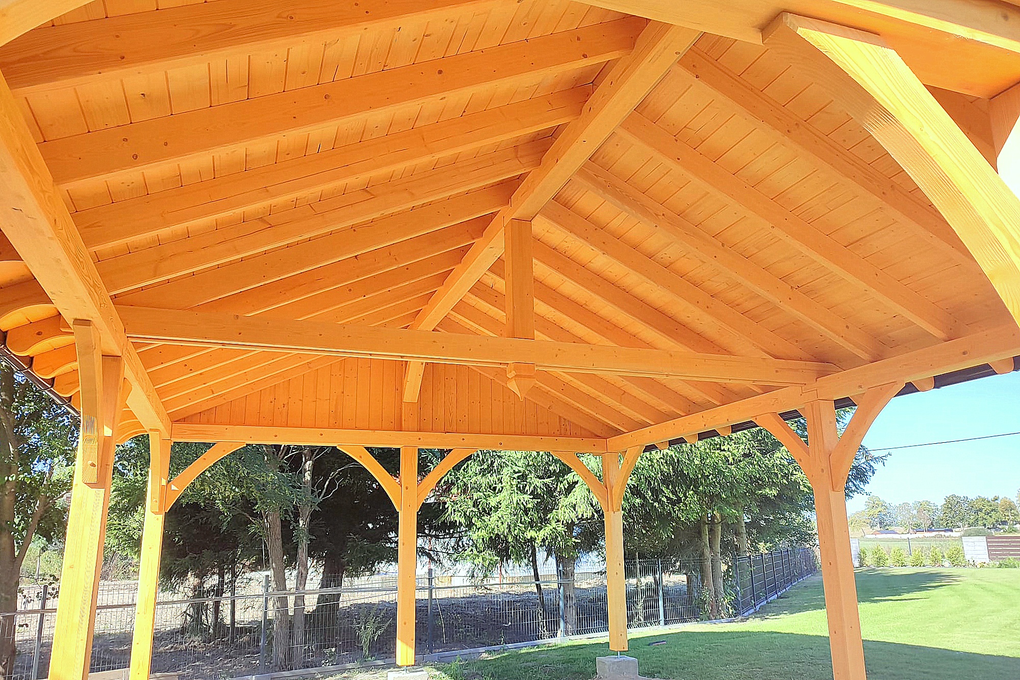 Oferta dotyczy wiaty szlifowanej. Wiata przez nas przygotowana jest docięta komputerowo na maszynie CNC oraz posiada wszystkie konieczne obróbki ciesielskie, tj. gniazda, czopy, wiercenia, jaskółcze ogony.