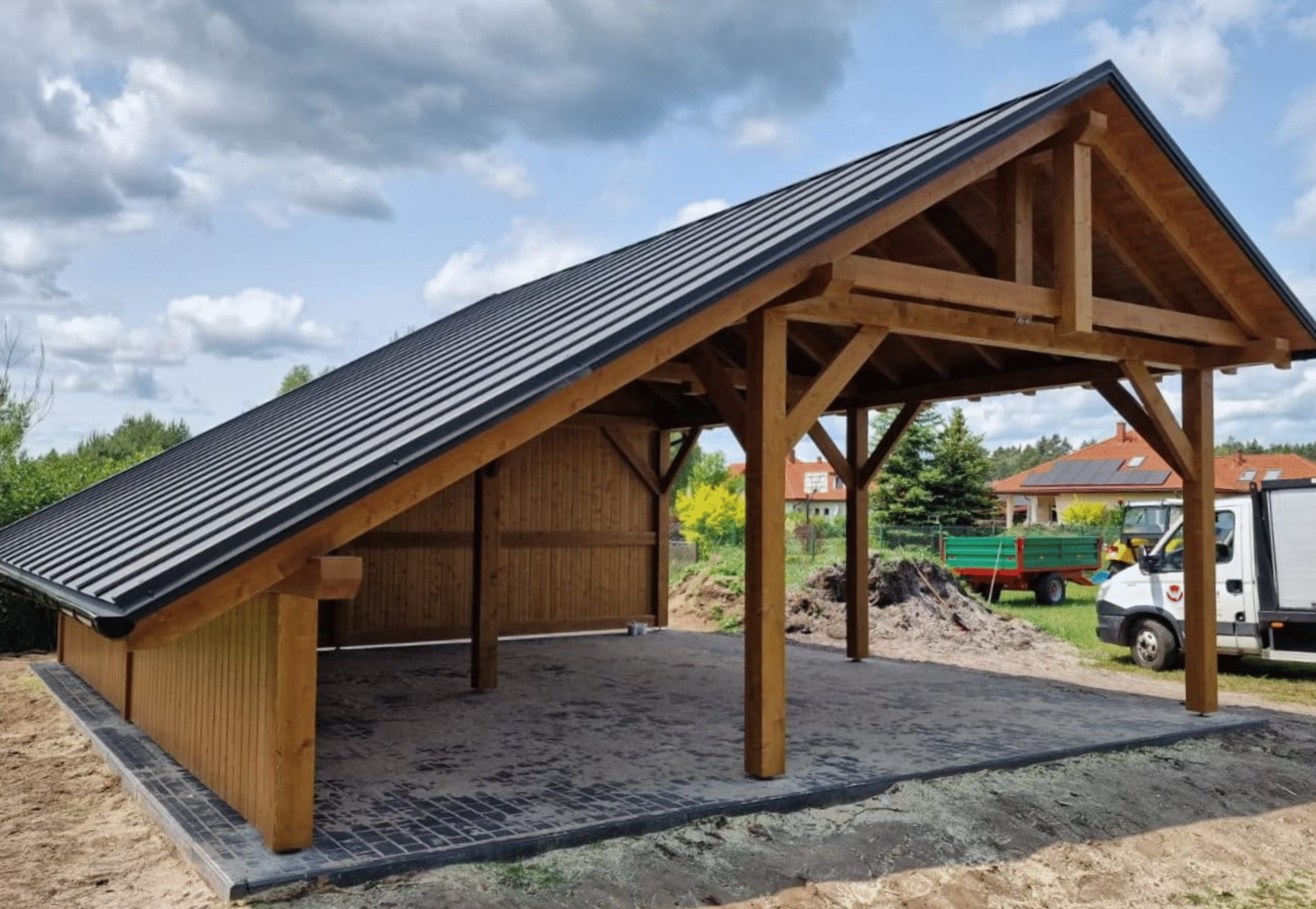 Wiata drewniana 6,5 m x 7,5 m z dachem dwuspadowym asymetrycznym to rozwiązanie stworzone z myślą o połączeniu funkcjonalności z nowoczesną technologią. Jedna z połaci została celowo powiększona, aby umożliwić montaż paneli fotowoltaicznych i maksymalizować uzysk energii słonecznej. Konstrukcja powstała z drewna DUO 16 x 16 cm, które dzięki klejeniu warstwowemu charakteryzuje się bardzo wysoką stabilnością i odpornością na skręcanie czy pękanie. Całość zachowuje nowoczesną, elegancką formę i świetnie wpisuje się w otoczenie ogrodu.