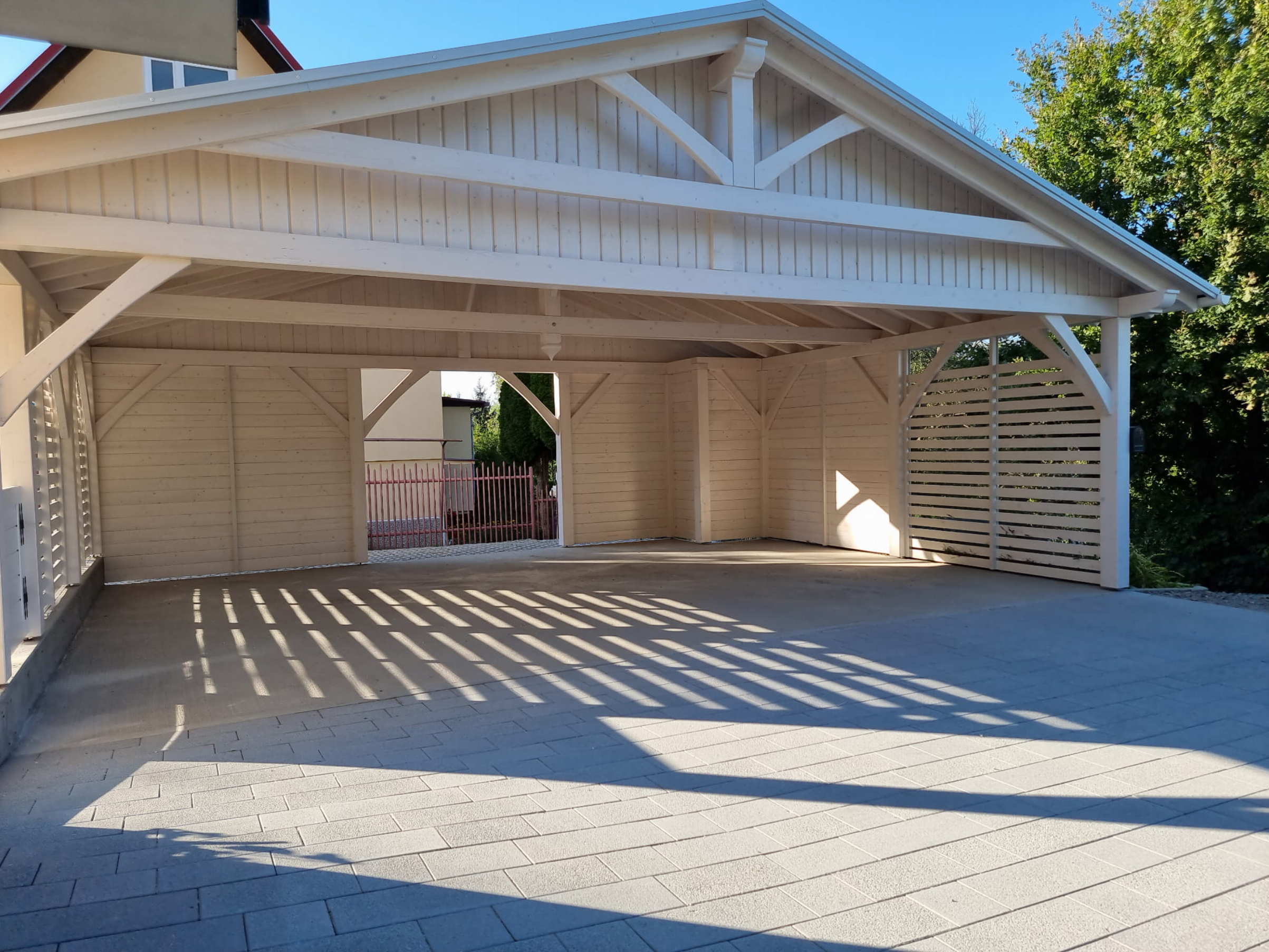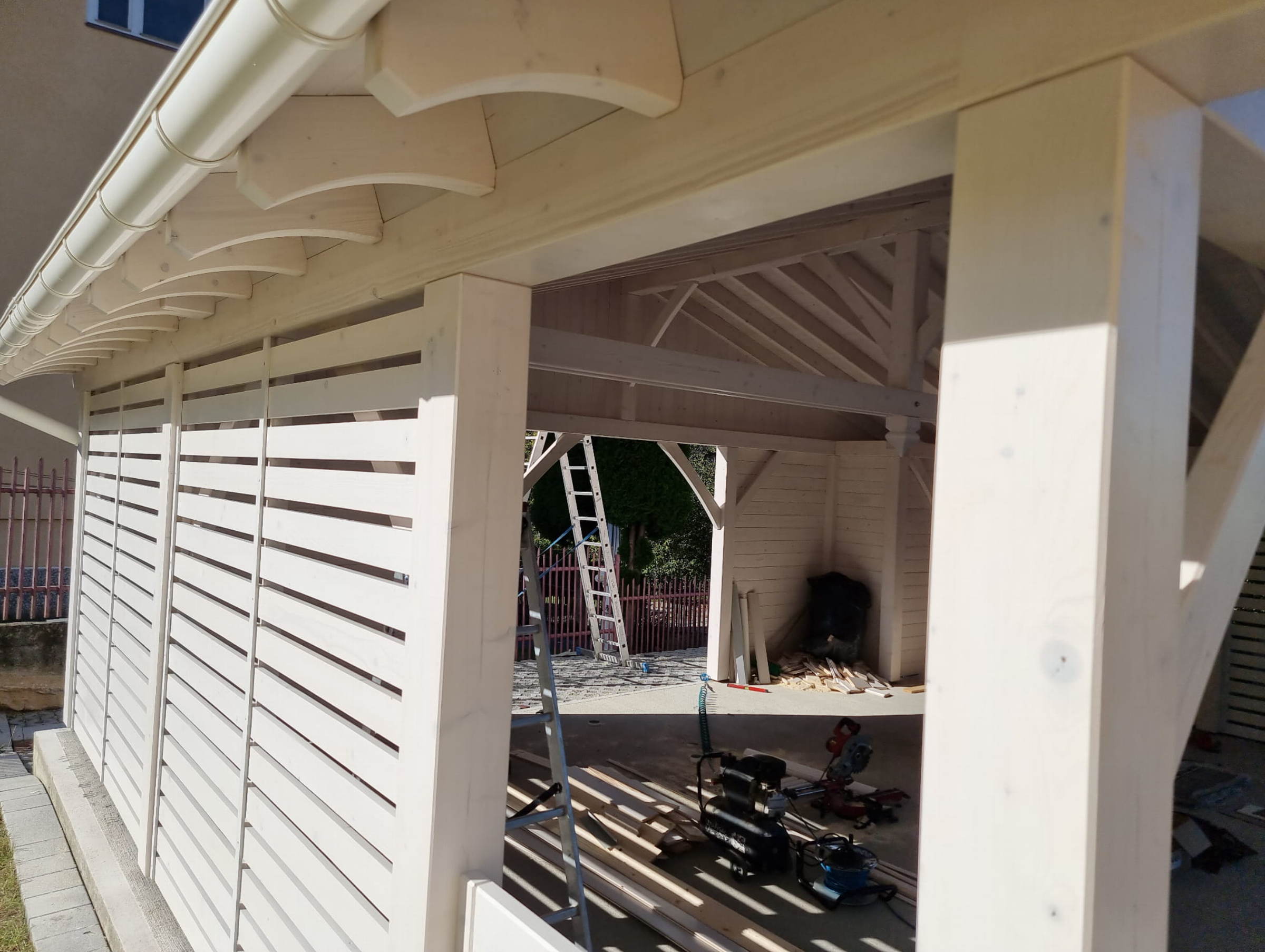 Wiata 6m x 8m Biecz – bogato zdobiona wiata w stylu skandynawskim o  przekrojach 16×16 cm z solidnego drewna konstrukcyjnego w technologii KVH .  Bryła wiaty została zaprojektowana z najwyższą starannością. Ściany boczne oraz tył częściowo został zabudowany ściankami ażurowymi stałymi. Naroże wiaty zostało zaprojektowane w taki sposób, aby zakamuflować istniejącą pompę ciepła, a tym samym zachować do niej całkowity dostęp.  Atrakcyjny wygląd drewnianej konstrukcji sprawia, że wpisze się ona w przestrzeń ogrodu, stanowiąc jego niewątpliwą ozdobę.