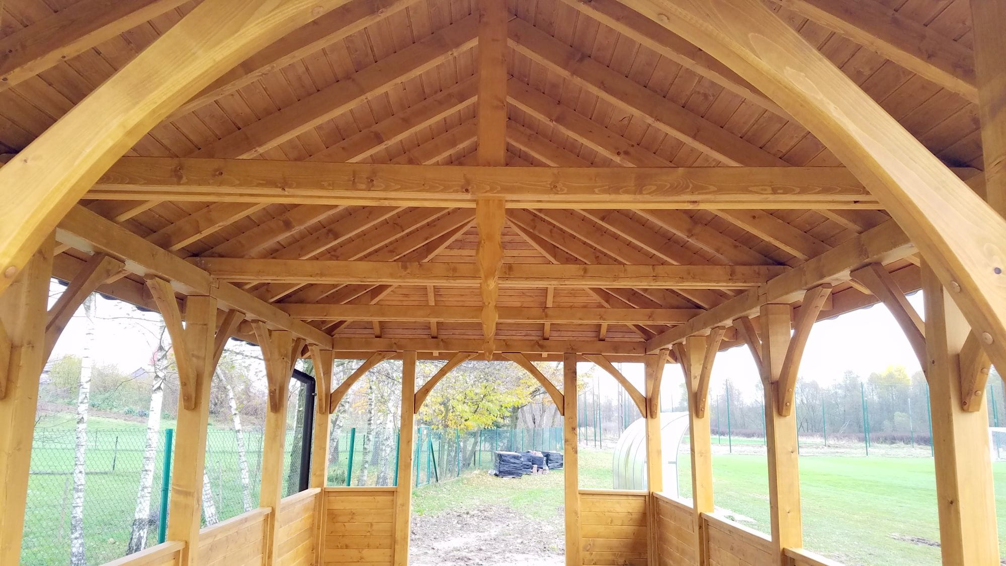 Wiata przez nas przygotowana jest docięta komputerowo oraz posiada wszystkie konieczne obróbki ciesielskie, tj. gniazda, czopy, wiercenia, jaskółcze ogony.